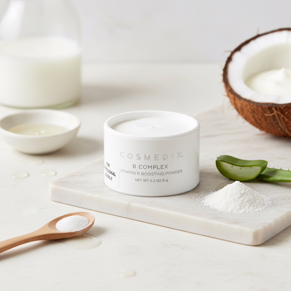 CosMedix B Complex Vitamin B Boosting Powder is crafted for those looking to support a balanced and radiant complexion with a simple addition to their skincare routine. This powder blends smoothly into your favorite serum or moisturizer, delivering a concentrated dose of Vitamin B Complex and other skin-supporting ingredients without changing texture.