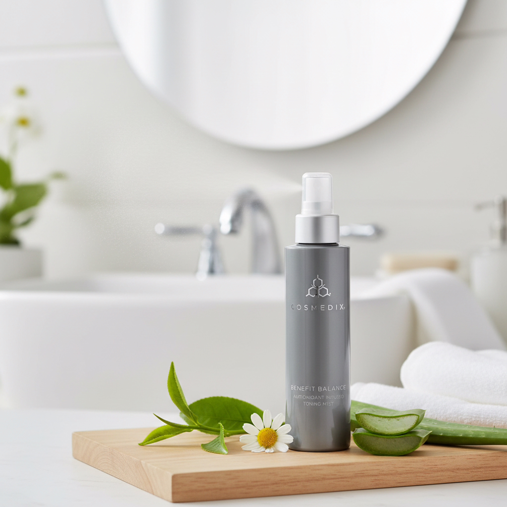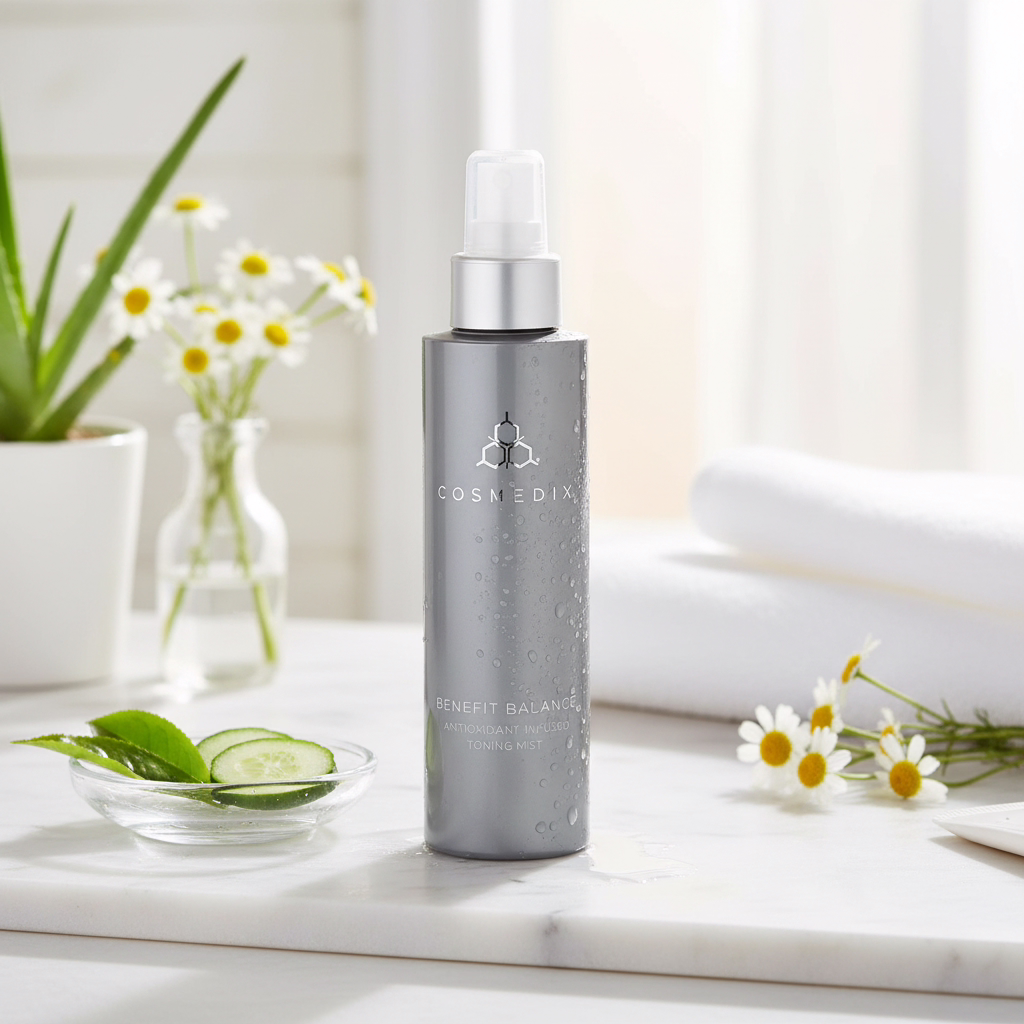 CosMedix Benefit Balance Antioxidant Infused Toning Mist offers a gentle way to refresh and protect normal, reactive, and dehydrated skin. This 150 ml spray combines antioxidant-rich Green Tea with soothing Aloe Vera and Chamomile to calm the complexion while preparing it for better absorption of your skincare treatments.