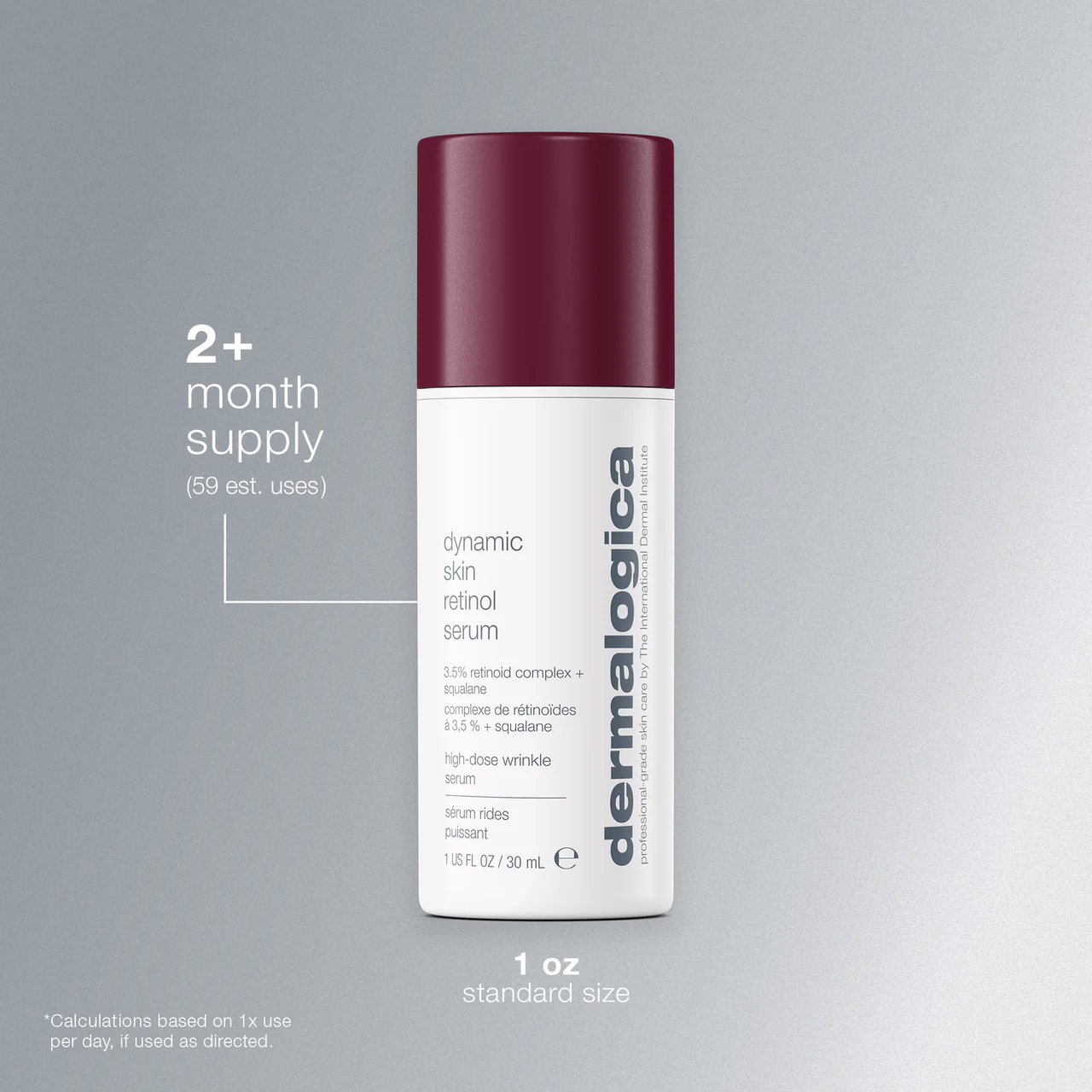 Dermalogica Dynamic Skin Retinol Serum is a high-performance treatment designed to visibly smooth, brighten, and renew the skin. Powered by a 3.5% Retinoid Complex, it helps reduce the appearance of fine lines, wrinkles, uneven texture, and visible pores while promoting a more even, radiant skin tone. The addition of squalane helps replenish hydration and supports the skin barrier, helping to minimise dryness often associated with retinol use. Gentle enough for nightly application, this advanced serum helps improve overall skin clarity, softness, and resilience, leaving skin looking healthier, smoother, and more youthful over time.